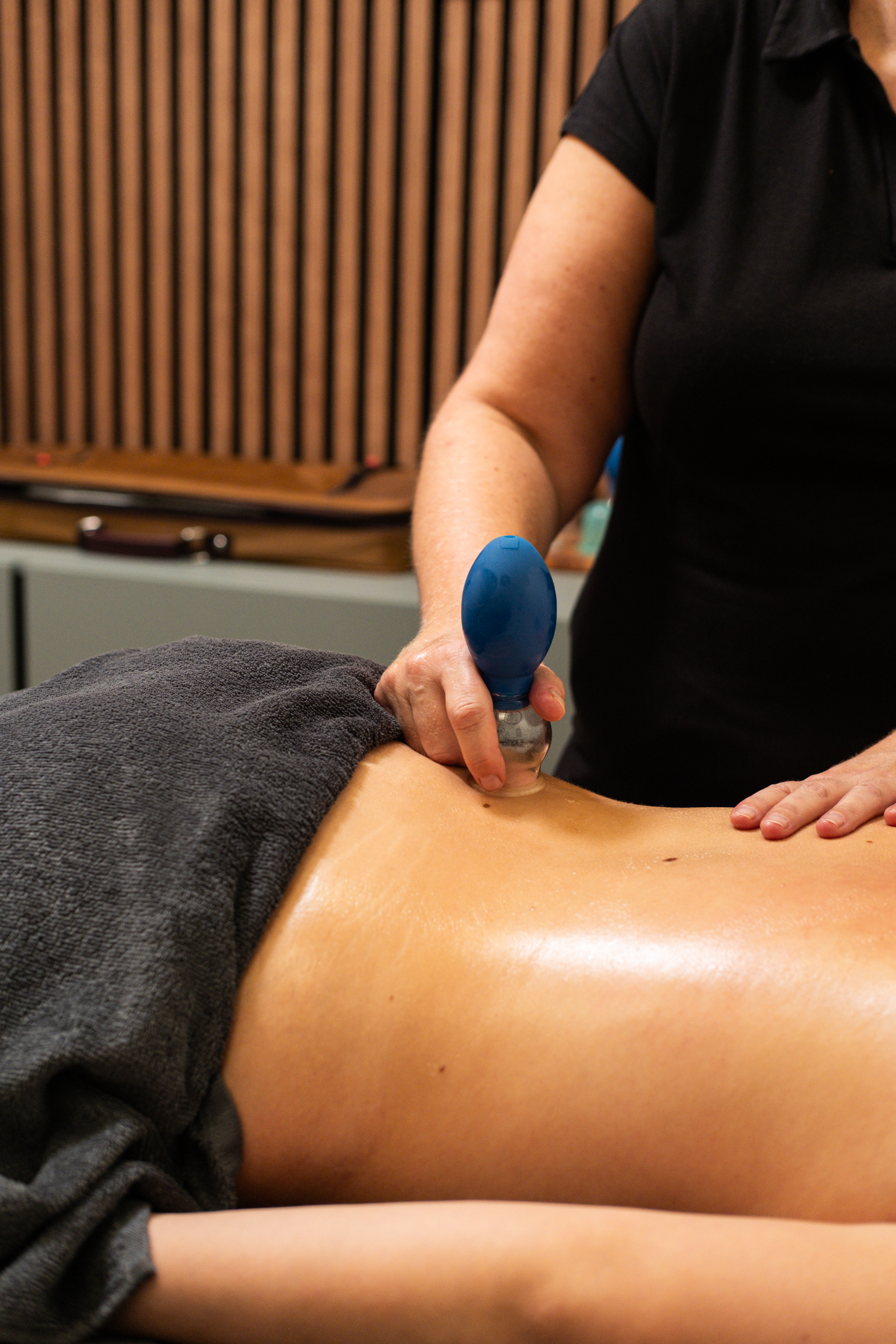 Qua cupping techniek is Transformational Cupping geen “normale” cupping! De tool is de glazen cup, door middel van het blauwe pompje trek ik de huid vacuüm en beweeg ik de cup over de huid.